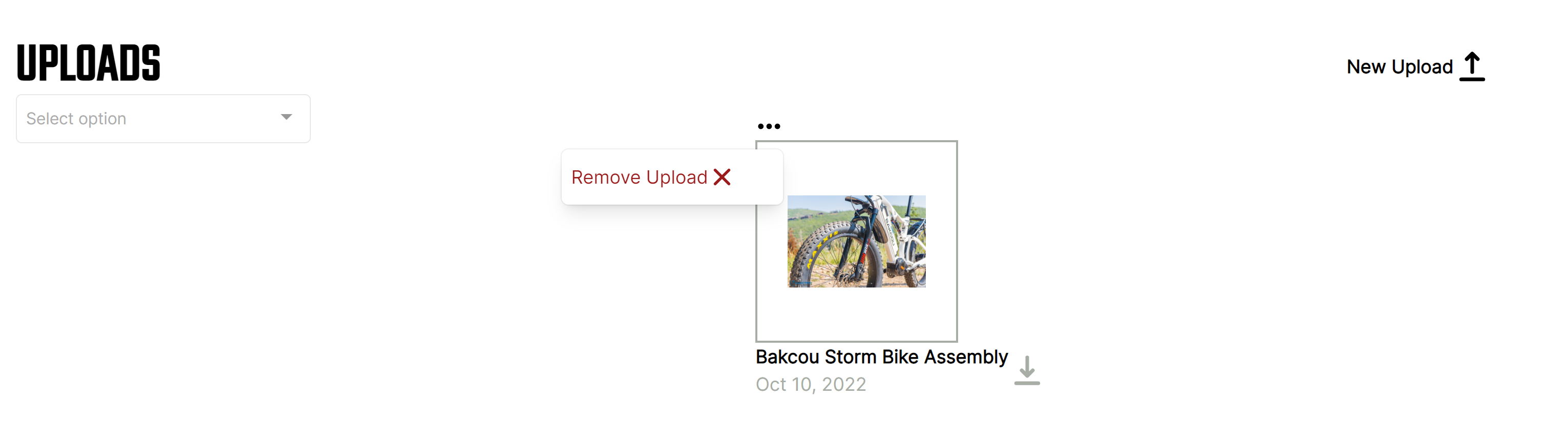 To remove a file upload, navigate to the all uploads page. Click on the three dots to the top left of a file upload thumbnail.